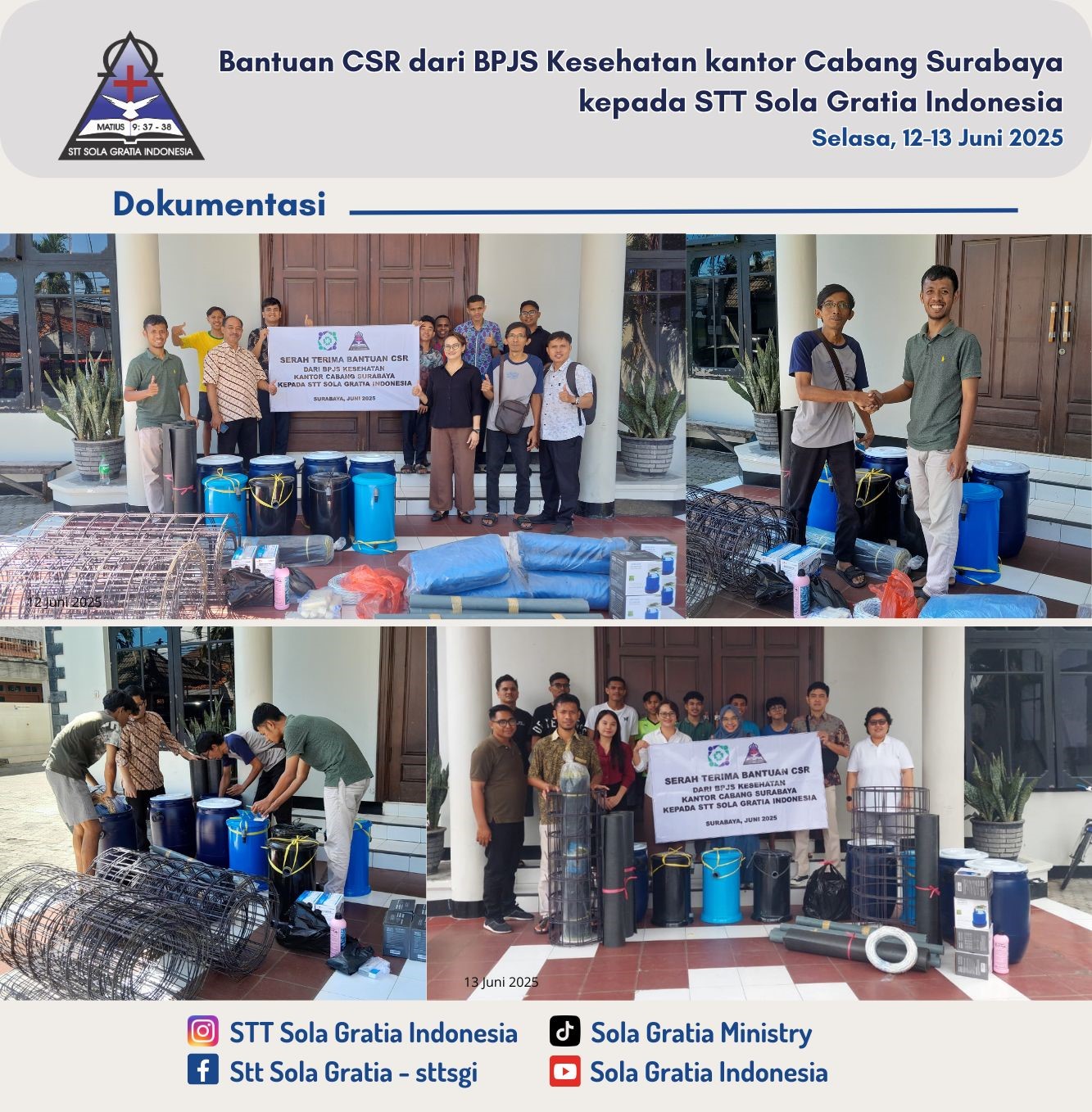Pada tanggal 13 Juni 2025, Sekolah Tinggi Teologi (STT) Sola Gratia Indonesia menerima secara resmi bantuan dari program Corporate Social Responsibility (CSR) yang diberikan oleh BPJS Kesehatan Kantor Cabang Surabaya. Bantuan ini berupa peralatan kolam ikan yang diharapkan dapat menunjang program kemandirian ekonomi dan ketahanan pangan di lingkungan STT Sola Gratia Indonesia.