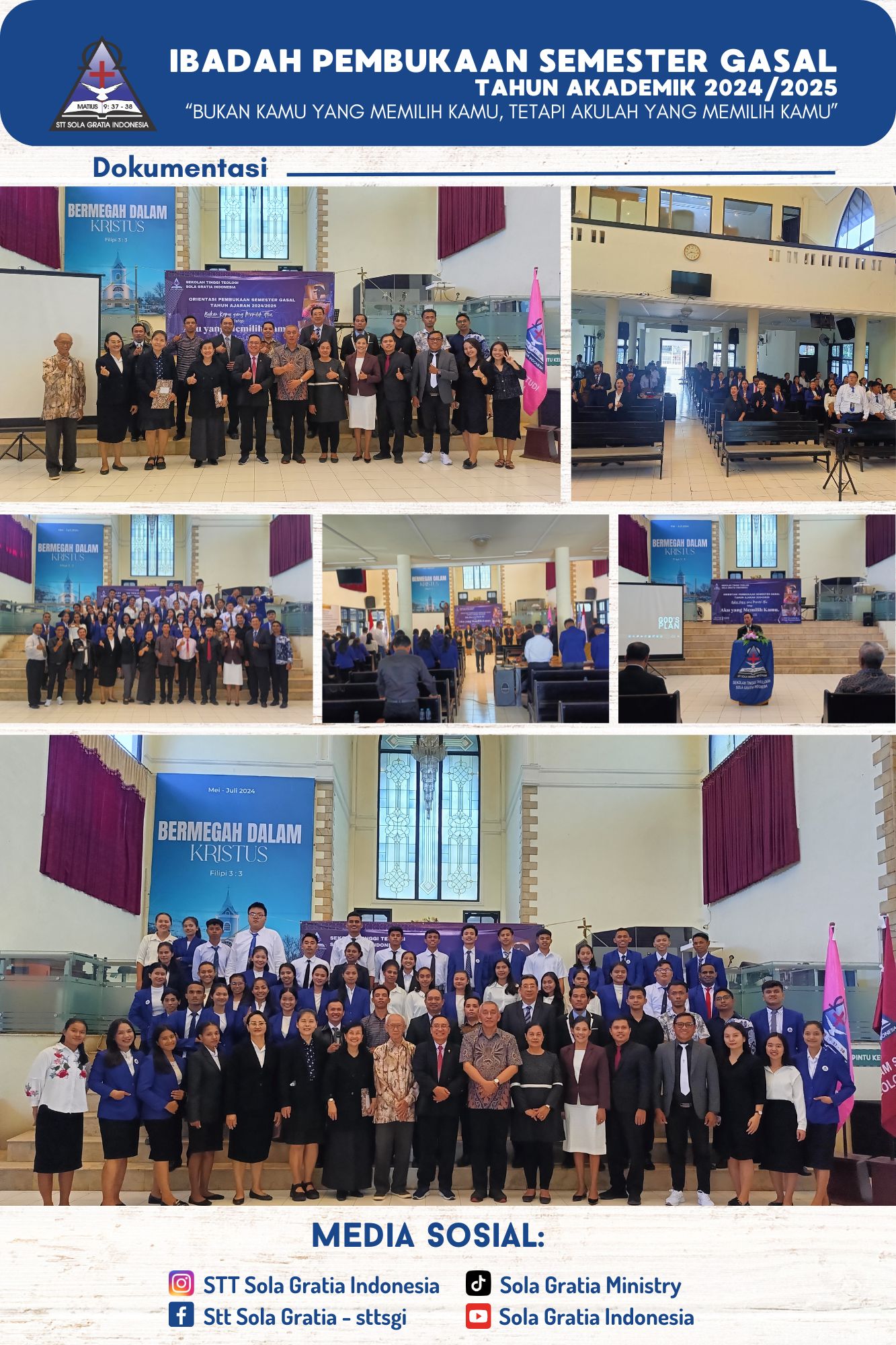 Puji Syukur kepada Tuhan Yesus Kristus, Sang Kepala Gereja, yang telah memimpin, menolong dan menyertai sehingga ibadah pembukaan semester 2024 ganjil dapat terlaksana dengan baik. Ibadah pembukaan disertai dengan pengarahan oleh pimpinan Yayasan Anugerah Semata Surabaya (YASS), serah-terima jabatan pimpinan STTSGI, pelantikan pimpinan terbaru. Dilanjutkan dengan pengarahan dari bidang 1 Akademik, bidang 2 Administrasi Umum dan Keuangan.